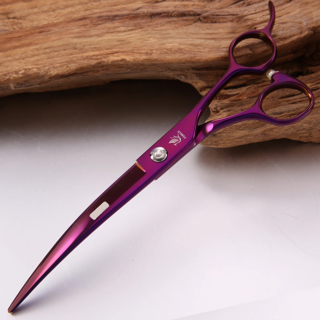 Achieve precise and professional results every time with our Professional 7.5 Inch Curved Grooming Scissors, crafted specifically for pet grooming. Whether you're a professional groomer or a dedicated pet parent, these scissors are designed to help you shape and style your pet’s fur with ease. Made from high-quality JP440C stainless steel, these scissors offer exceptional sharpness and durability, ensuring clean cuts every time. The elegant purple finish adds a touch of style to your grooming tools, making these scissors as beautiful as they are functional. Perfect for detailed work around the face, paws, and tail, these curved scissors allow you to create smooth, rounded edges effortlessly.