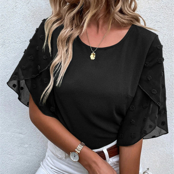 Irregular Ruffled Mesh Blouse Women's Pullover Pleated Slim Top