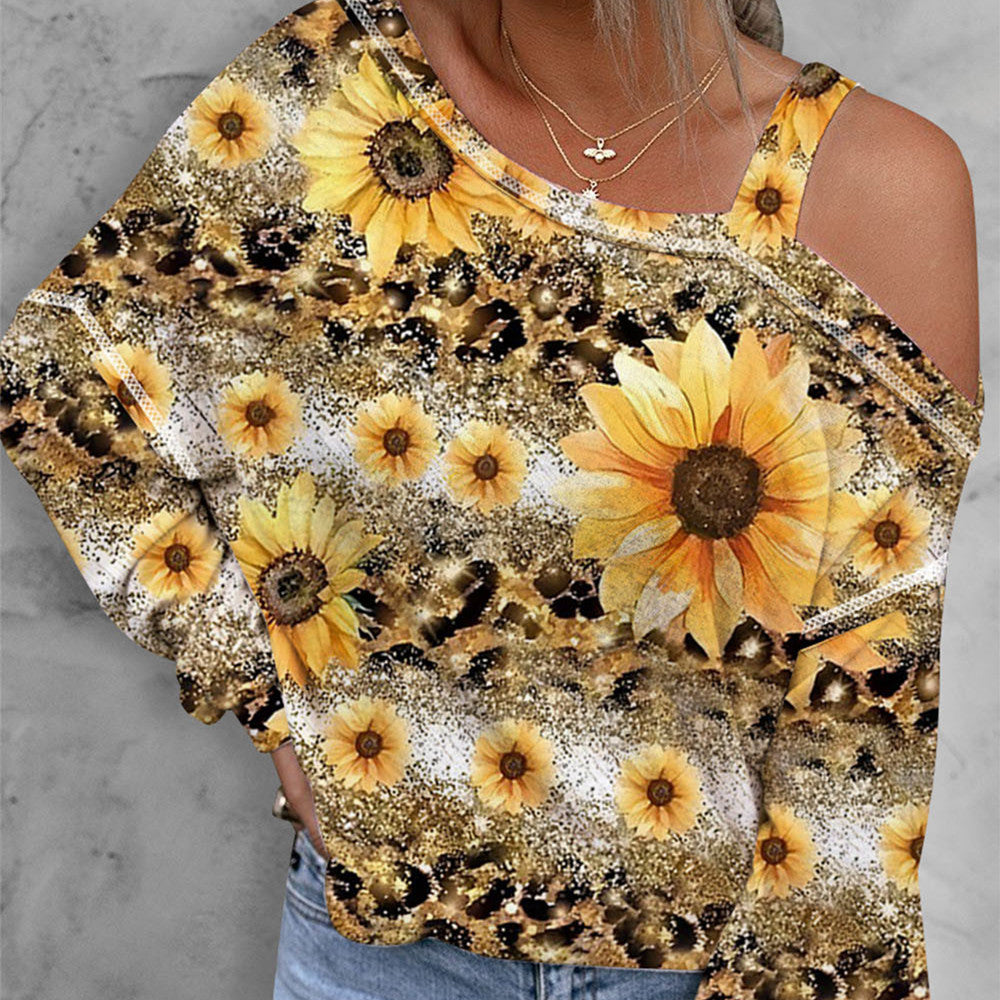 Women's Oblique Shoulder Pullover T-shirt SUNFLOWER Printed Casual Loose Top