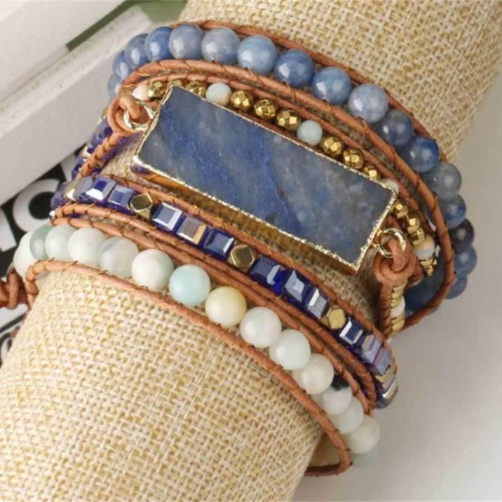 Multilayer Leather Wrap Crystal Blue Aventurine Bracelet