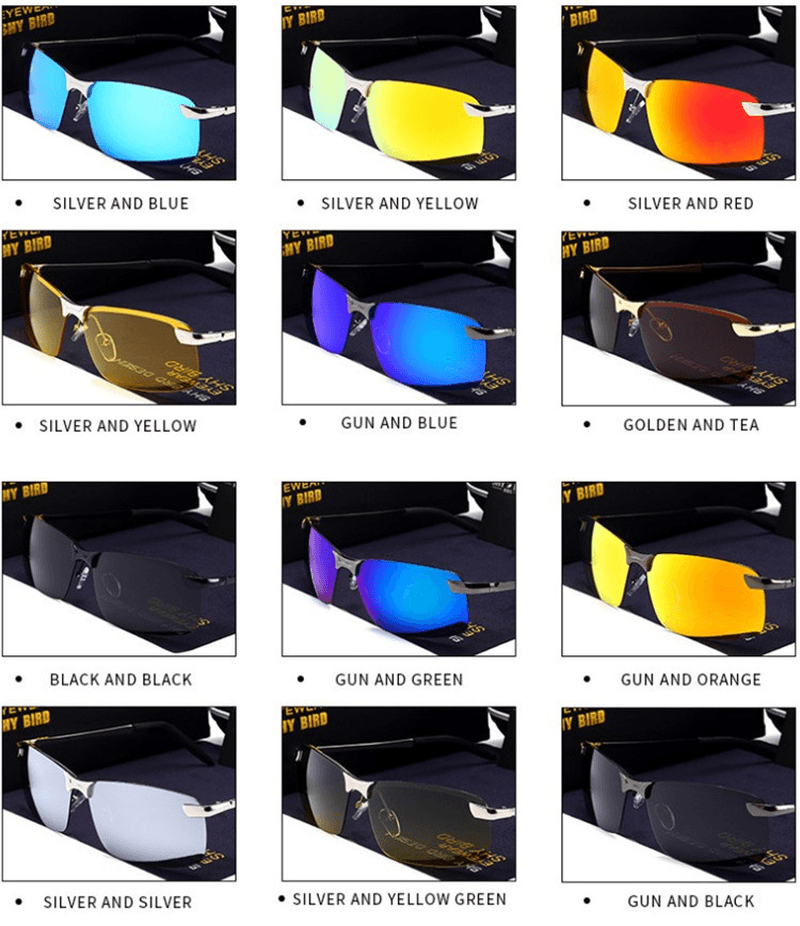 Lens color: black frame black film, gun frame black film, gold frame tea film, silver frame mercury film, silver frame ice blue film, gun frame dark blue film, silver frame orange red film