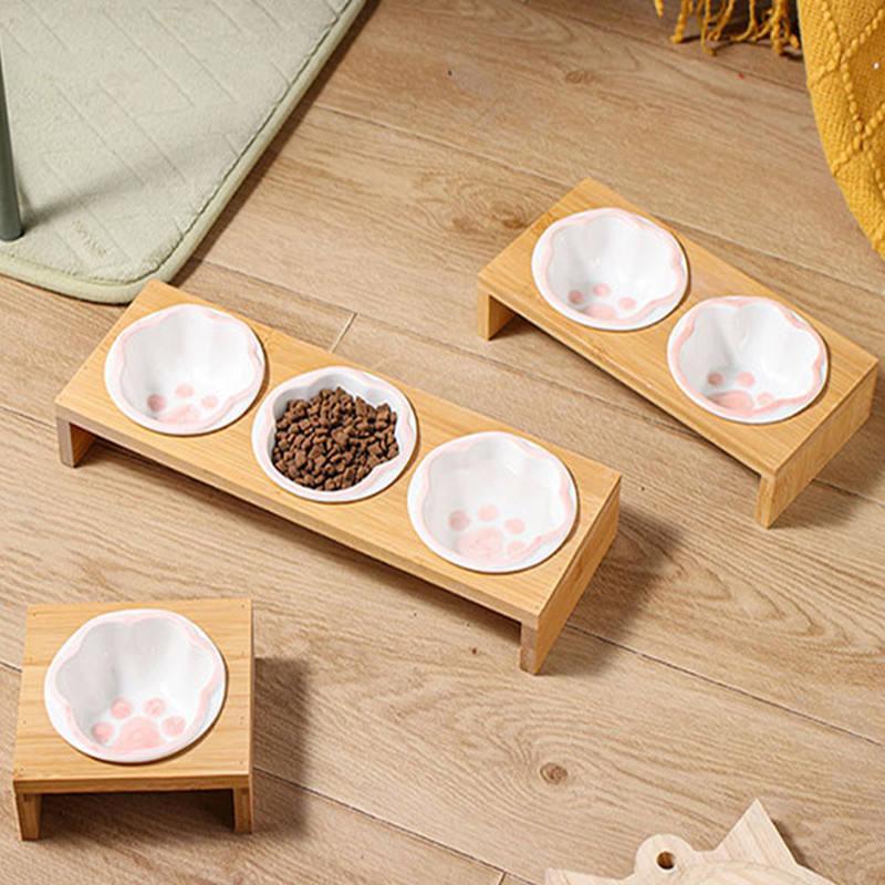 Cartoon Paw Design Raised Pet Bowls with Wooden Stand