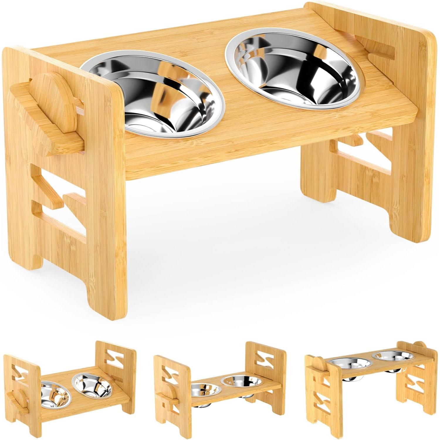 Adjustable Elevated Slanted Pet Feeding Bowl with Bamboo Stand