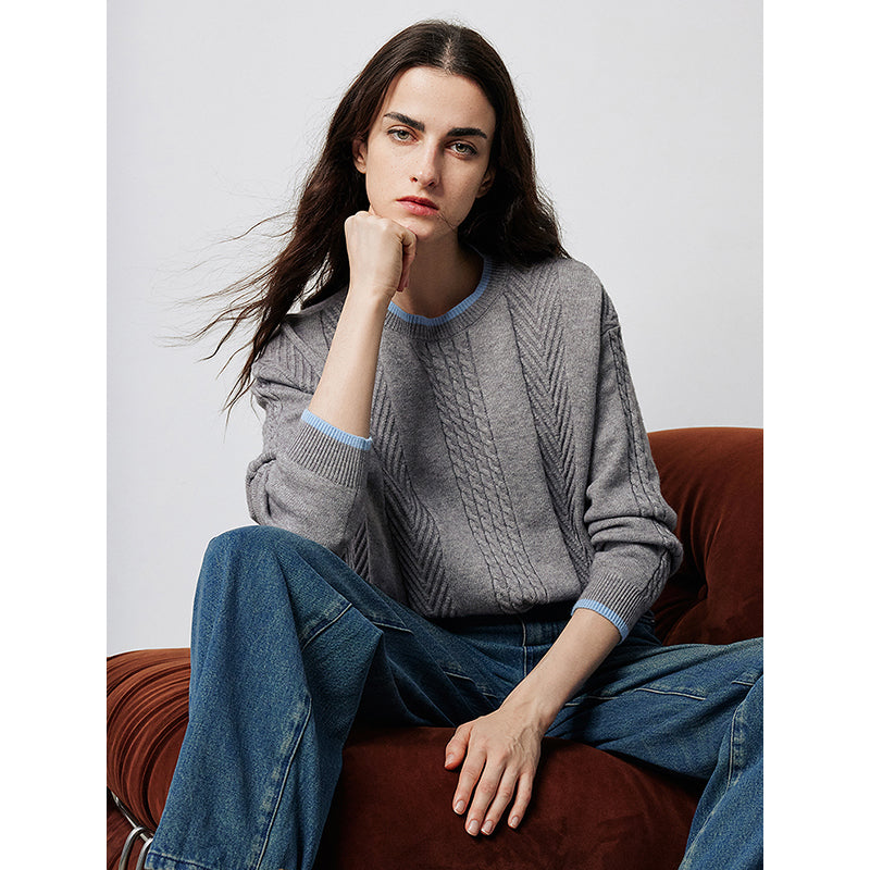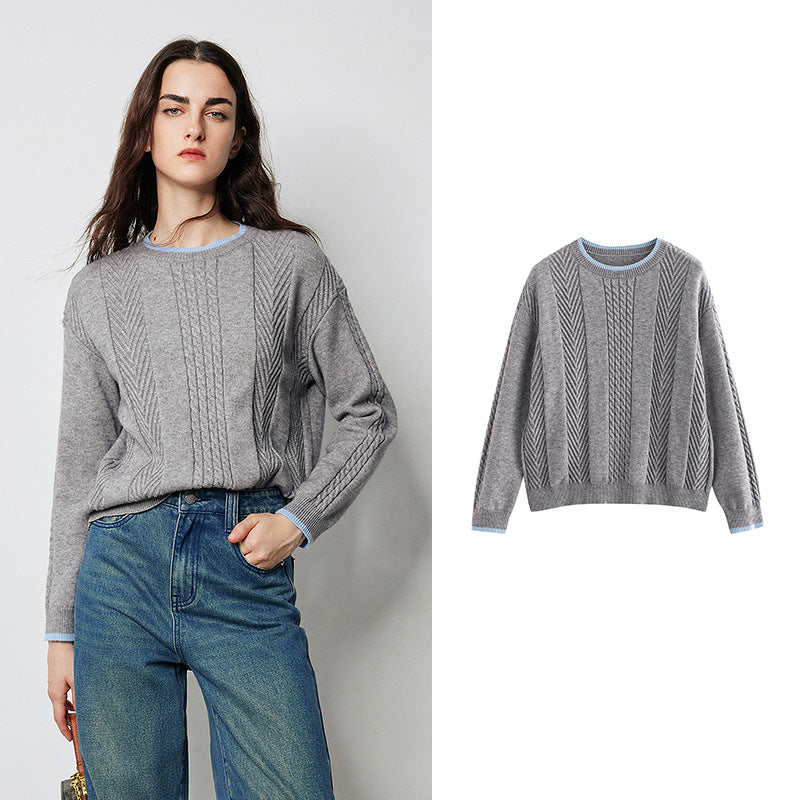 Step into the cooler seasons with a perfect blend of style and comfort. The Women's Contrast Color Twisted Pattern Pullover Sweater in gray is your ideal companion for autumn and winter. Crafted with care and attention to detail, this sweater seamlessly merges classic elegance with modern flair, making it a must-have addition to your wardrobe.