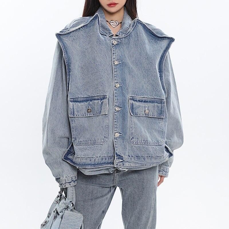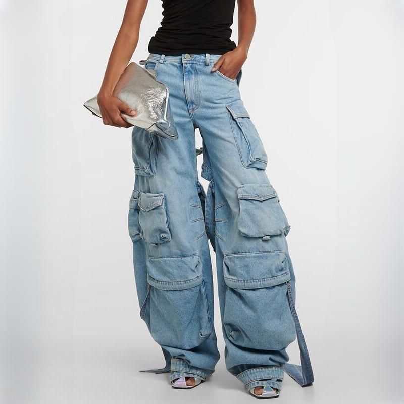 High Waist Spliced Cargo Denim Trousers