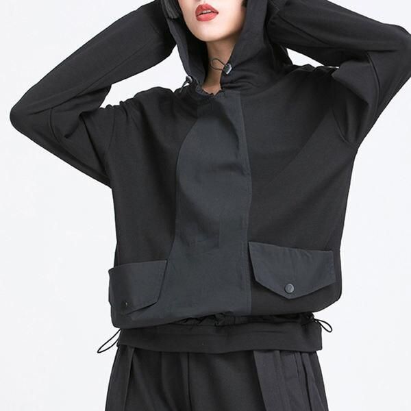 Women's Black Drawstring Hooded T-shirt with Pocket