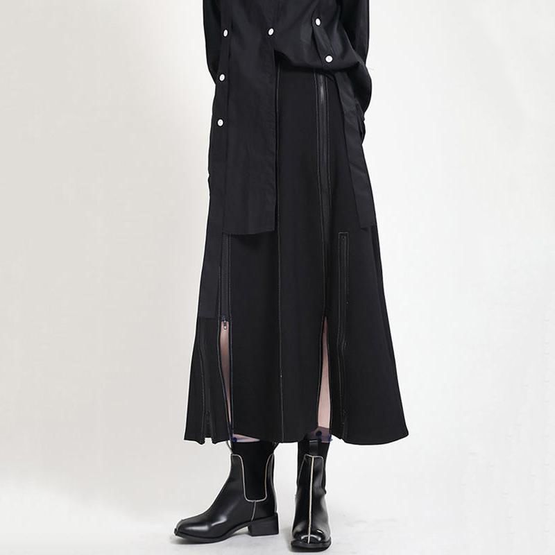 Chic Black Mid-Calf Casual Skirt with Elastic Waist and Side Slit