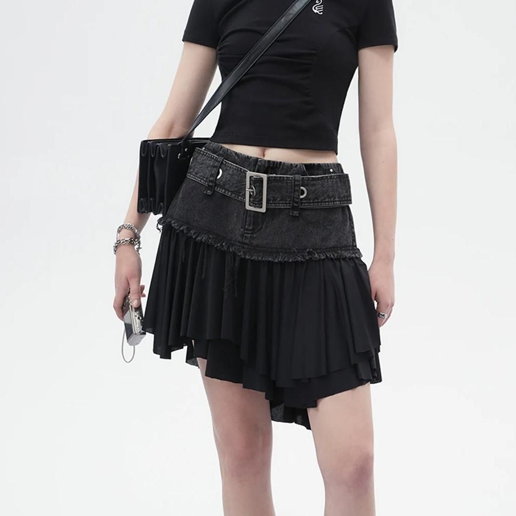 Street Black Denim Mini Skirt with Ruffled Hem