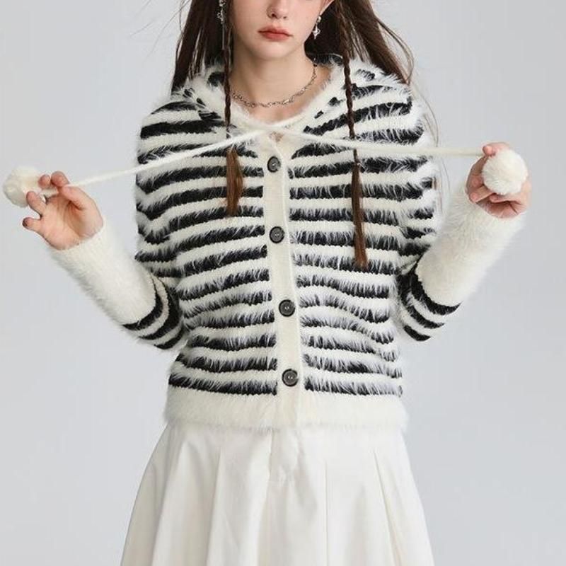 Striped Hooded Mohair Cardigan - Y2K Style Pom-Pom Knit Top