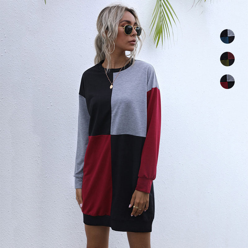 New Splicing Long Sleeve Round Neck Color Contrast Pullover Dress For Women