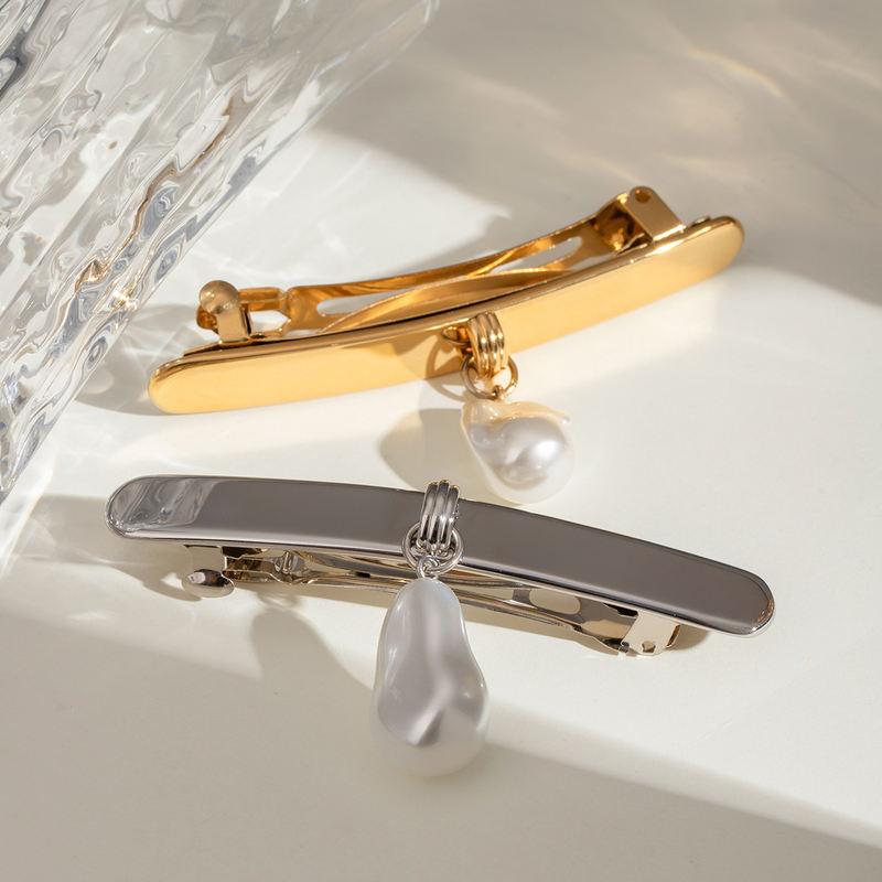18K Gold Plated Stainless Steel Rectangular Pendant Glass Pearl Hairpin Clip