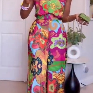 Printed Cropped Sleeve Cardigan Wide Leg Pants Suit