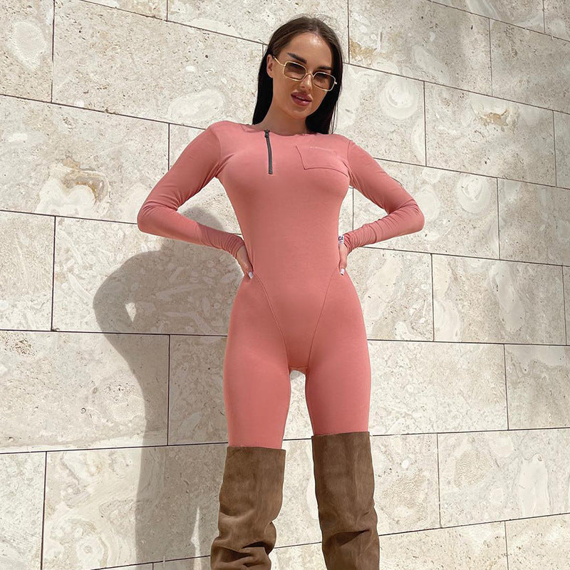 Women's Sports Casual Solid Color Round Neck Zipper Pocket Long Sleeve Slim Fit One-piece Trousers