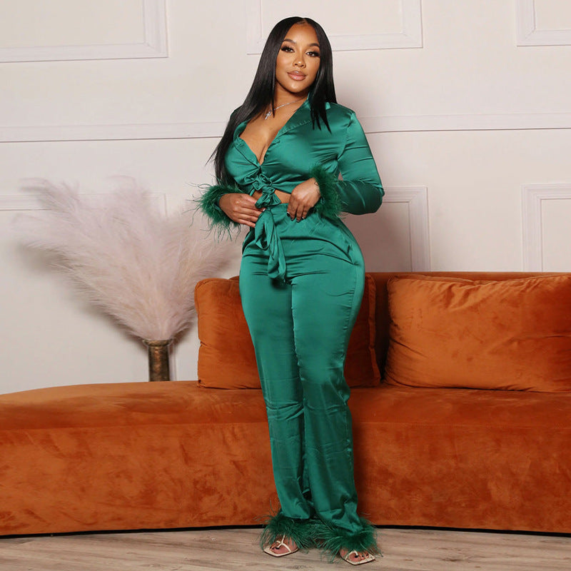 Solid Color Polo Collar Single-breasted Long Sleeve Tied Top Smart Trousers Suit
