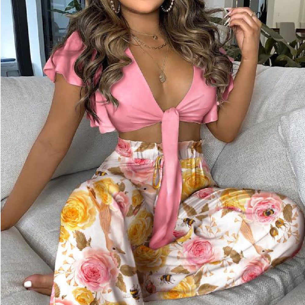 Women's Fashion Lantern Sleeve Printed Top Wide Leg Pants Two-piece Set