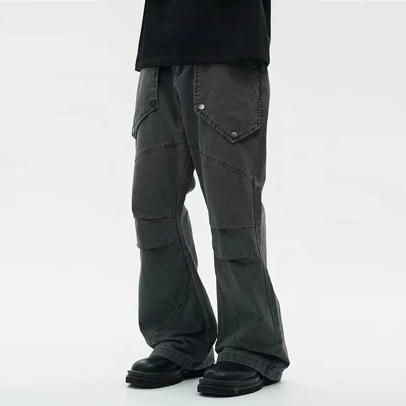 Black Washed Pleated Large Pocket Design Loose Micro-flared Trousers