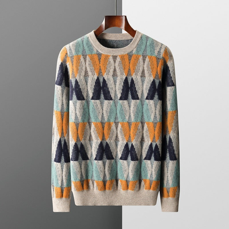 Round Neck Multicolor Woolen Sweater Men's Plaid Jacquard Knitted Sweater