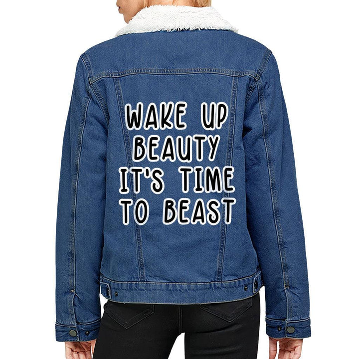 Wake Up Beauty It's Time to Beast Women's Sherpa Denim Jacket - Funny Ladies Denim Jacket - Quote Denim Jacket