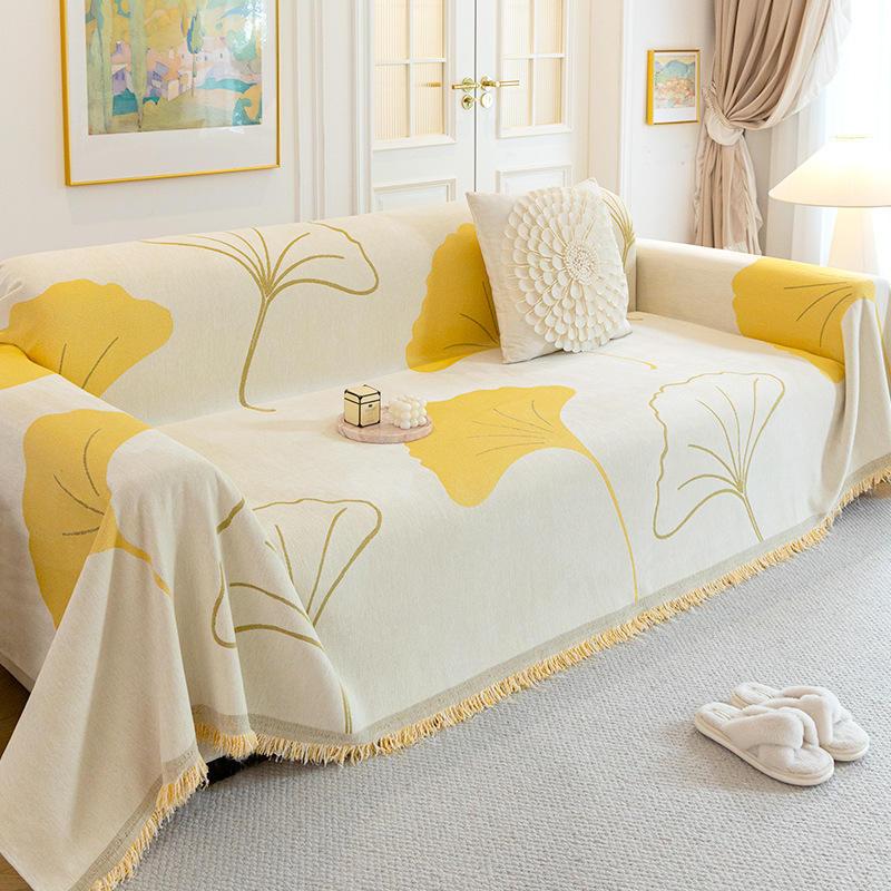 Universal Anti-Slip Jacquard Sofa Cover with Fringe – Ginkgo Leaf Design
