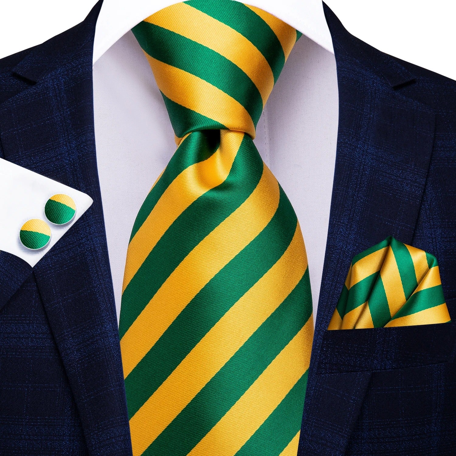 Yellow & Green Striped Silk Necktie Set for Men – Tie, Handkerchief, Cufflinks