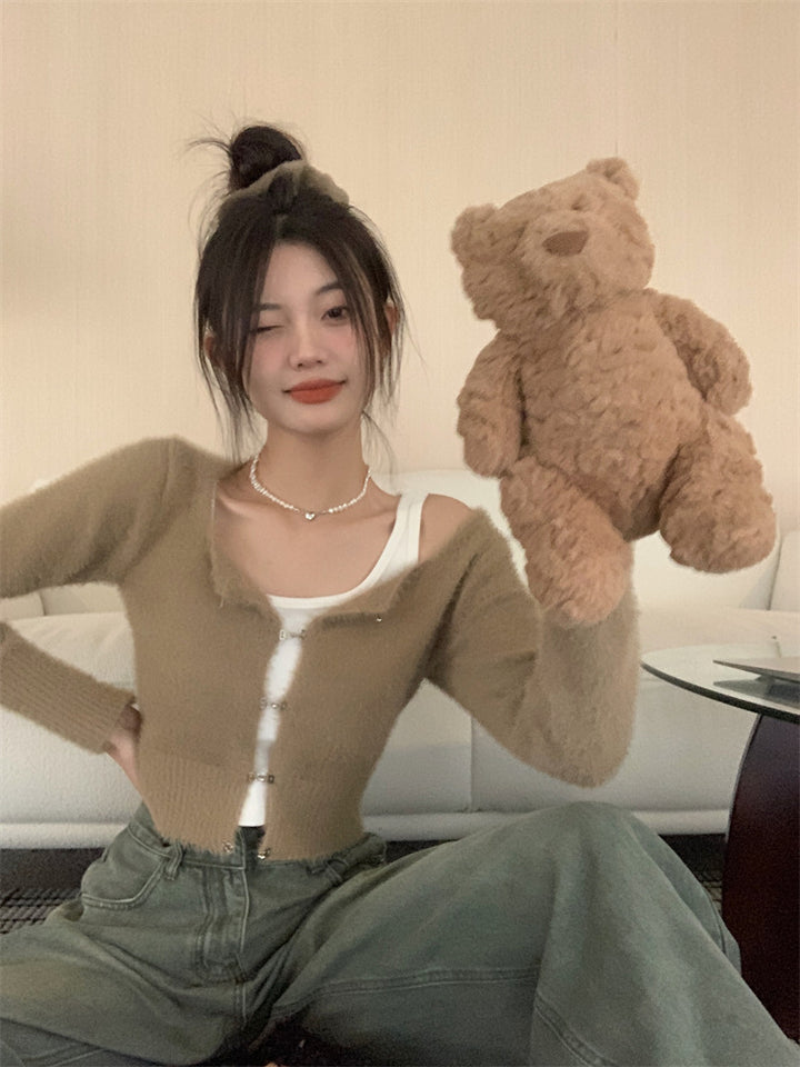 Coffee Colored Imitation Mink Velvet Knitted Cardigan For Women