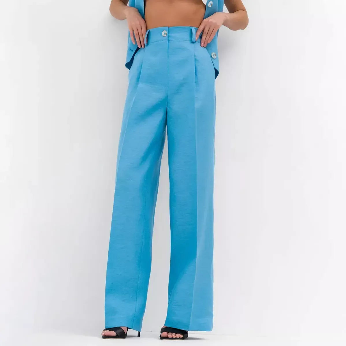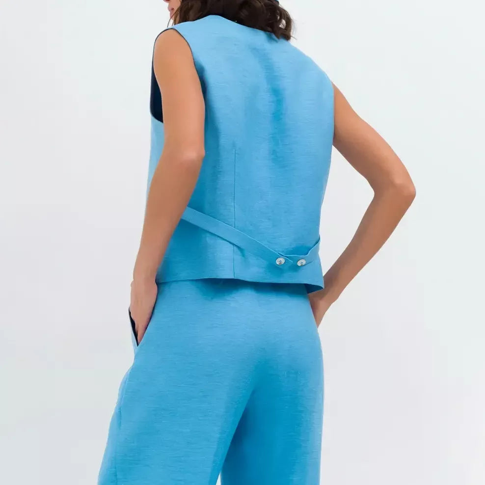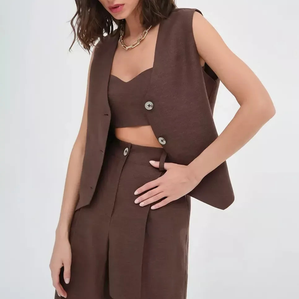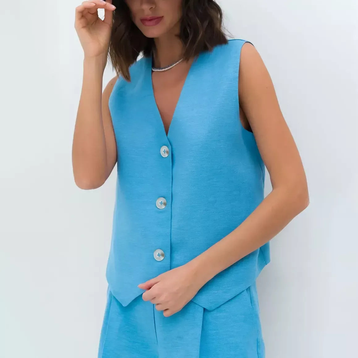 Experience the difference with our specially crafted set. The regular fit flatters a range of body shapes, providing a graceful silhouette. Crafted from a premium mix of cotton and linen, the woven fabric ensures breathability and longevity, suitable for all seasons. Its solid pattern exudes a timeless charm, and the tasteful button accents add a refined edge. The sleeveless vest top offers freedom and flair, embodying high-street fashion at its finest.