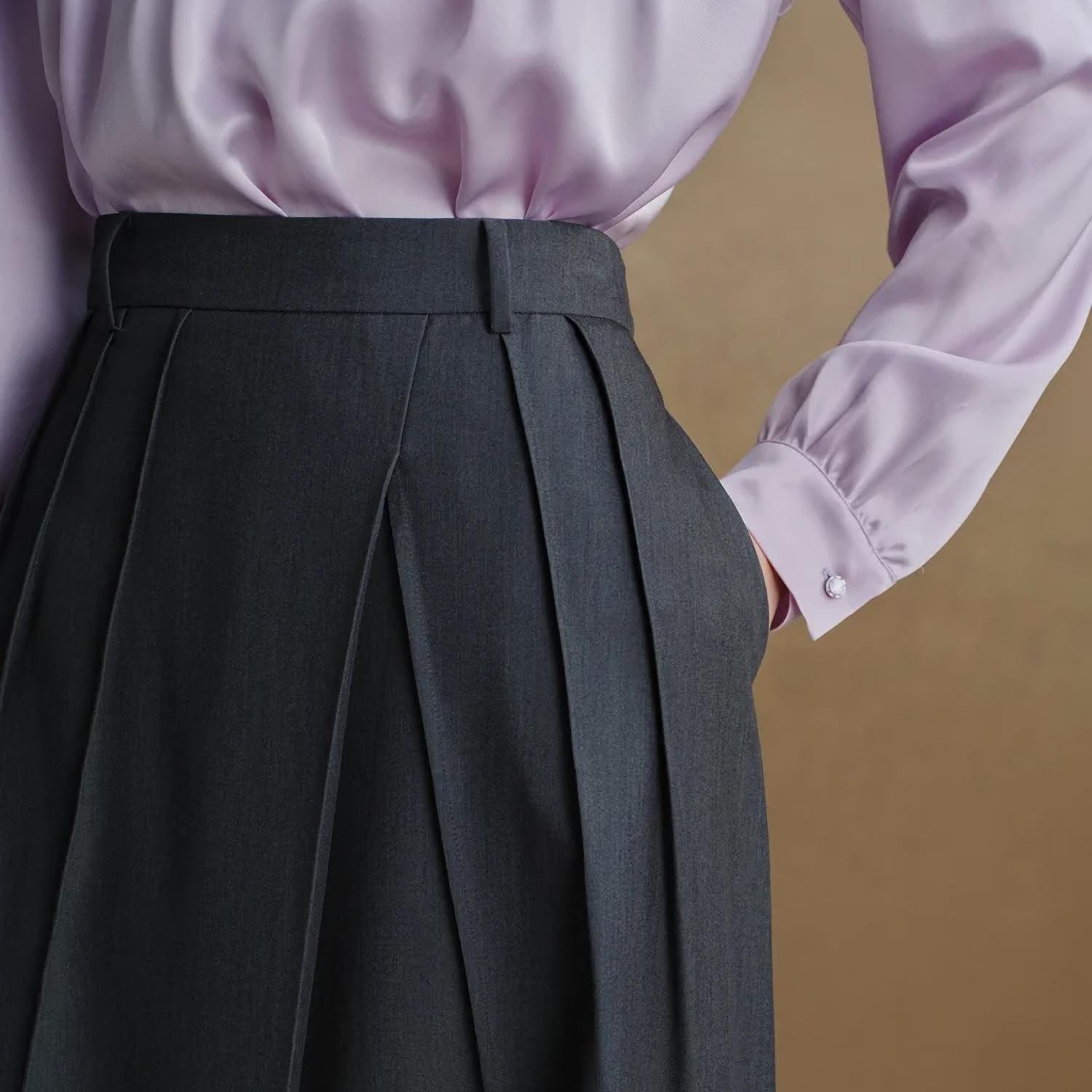 Introducing the Office Lady Dark Grey A-Line Skirt, a perfect blend of sophistication and modern style. Designed for the professional woman, this high waist, mid-calf pleated skirt with an asymmetrical cut brings a unique flair to your office attire. Crafted to offer both comfort and elegance, this skirt will be your go-to piece for the autumn and winter seasons.
