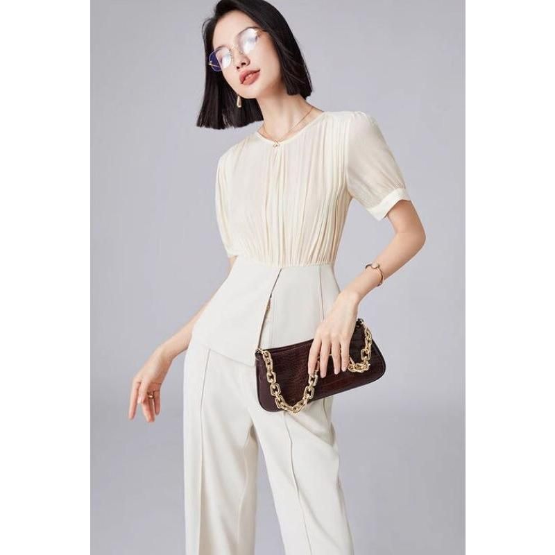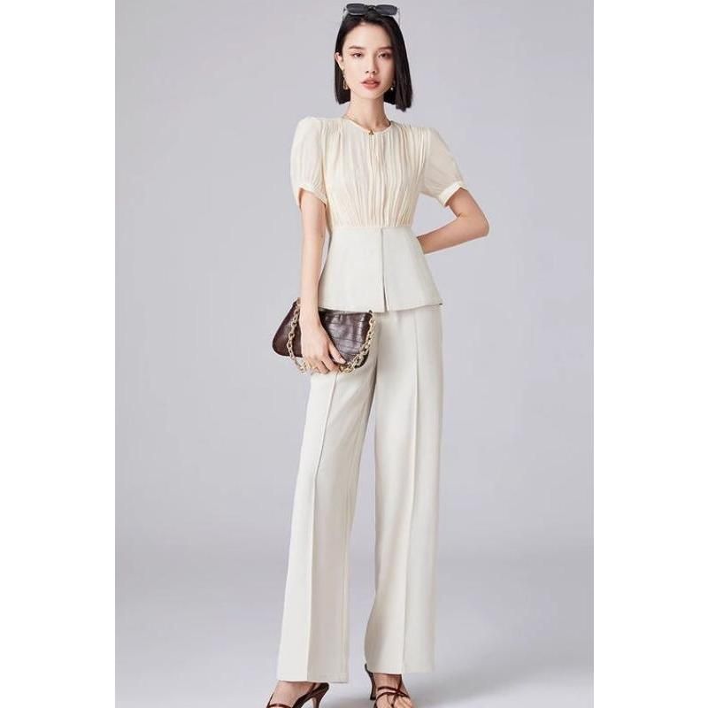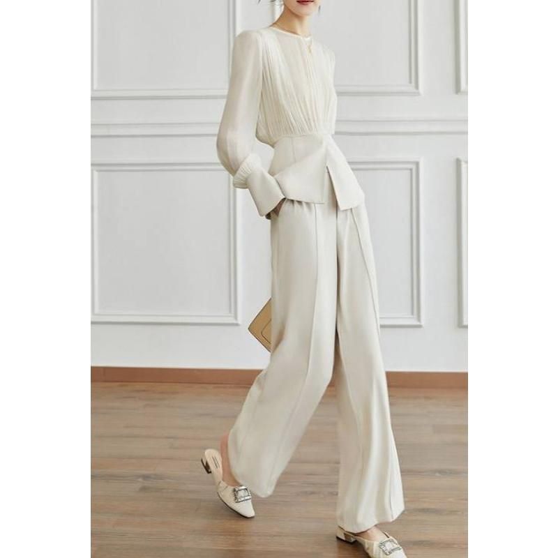 Our set features a mid-waist design that flatters your figure, paired with wide leg pants that offer both comfort and style. The laminated fabric, comprising 31% to 50% polyester, ensures durability and a gentle feel against the skin. With its full-length shirt sleeves and O-neck collar, this ensemble exudes a chic and timeless elegance. The pants come with a convenient zipper fly for easy wear.