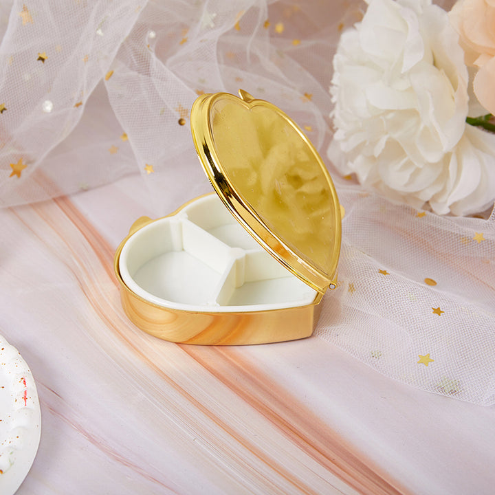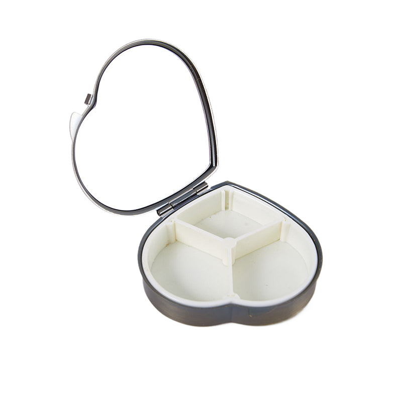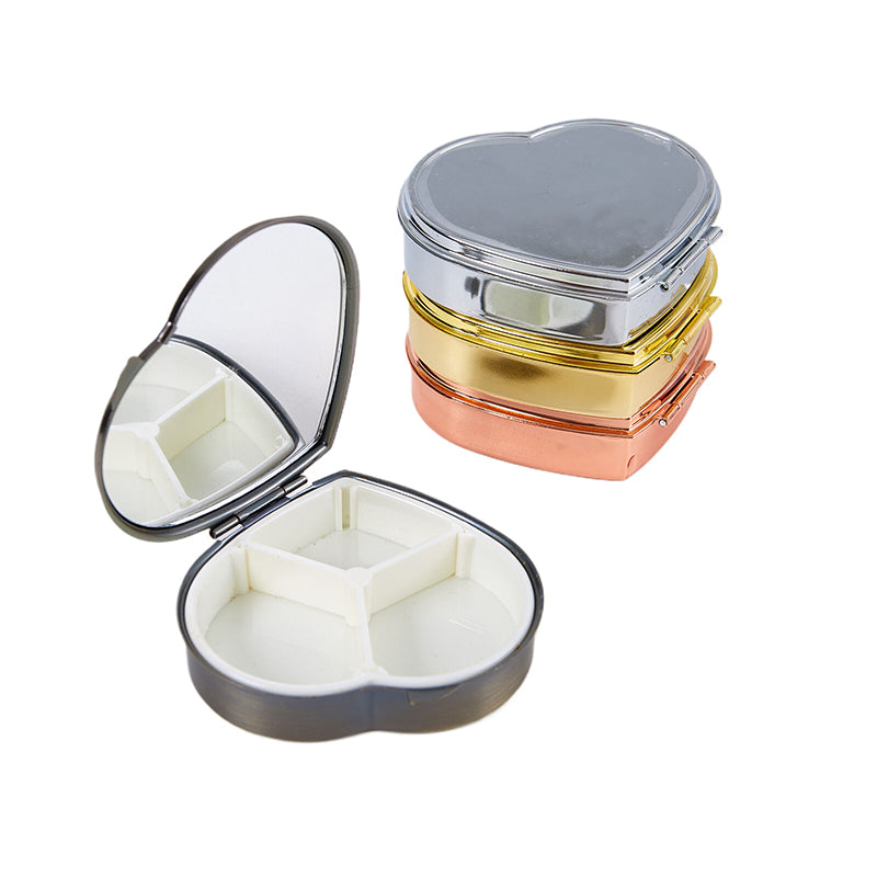 Keep your daily medication, vitamins, or other small items safe and organized with our Heart-Shaped Metal Pill Box. This chic and practical accessory is designed for those who value convenience and style. Its heart shape adds a touch of elegance, making it not just a pill case but a statement piece you can carry anywhere. Our metal pill box is sturdy and durable, ensuring long-lasting use. The push-button switch allows for easy access, making it suitable for everyone, regardless of age. With three compartments inside, you can organize your pills or other small items efficiently. The built-in mirror adds an extra layer of utility, making it perfect for quick touch-ups on the go. This pill box is not only functional but also versatile. Besides holding pills, it can store coins, jewelry, or any small essentials you might need throughout the day. Its compact size means it fits effortlessly into your wallet, pocket, purse, travel bag, or briefcase, ensuring you have your items readily accessible at all times.