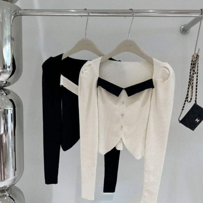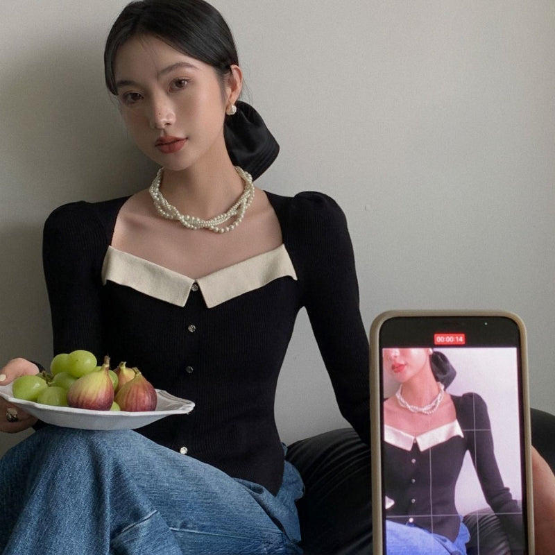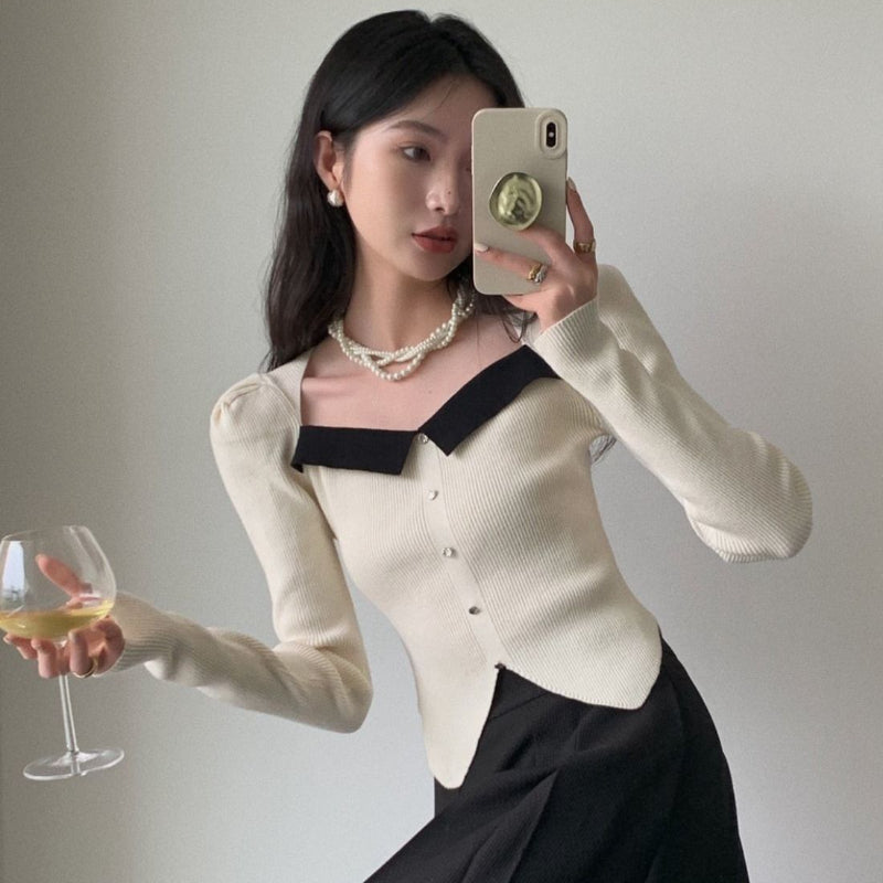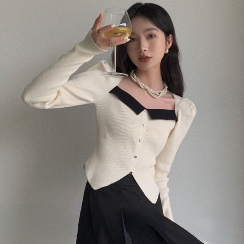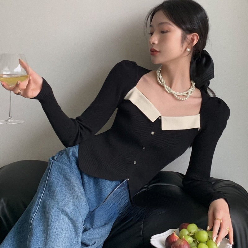 Irregular Color-blocked Collarbone Puff Sleeve Sweater