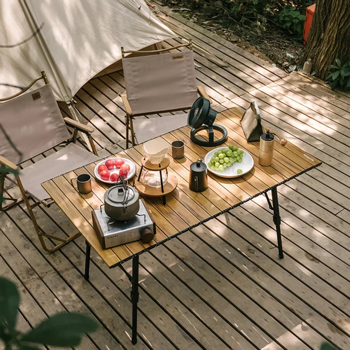 Elevate your outdoor adventures with the Portable Folding Aluminum Camping Table, an essential piece of gear for any camping, beach, or picnic trip. Designed to offer convenience and durability, this table is perfect for those who love to embrace the great outdoors without compromising on comfort. Its lightweight yet sturdy aluminum alloy construction ensures you can easily carry it to any location, while its stylish wood color finish adds a touch of elegance to your outdoor setup.