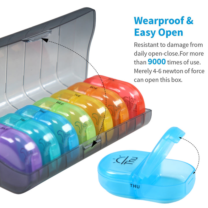 • Durable Design: The pill box features long-lasting labels and hinges that can withstand 10,000 uses without breaking.